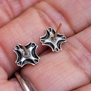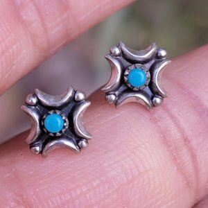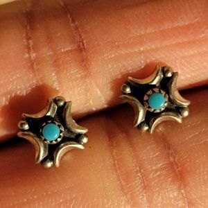 Super cute little studs. 925 sterling silver base with goldfilled stick posts. Sawtooth bezel set round turquoise cabachon flanked by crescent moons on all sides with raindrops. Shadow box detail between the turquoise and moons. Will include generic backings. Vintage with tons of amazing patina. Price is FIRM, thank you!