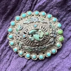 Design/Materials: Turquoise stones and metal flower florets make up the oval metal plated base, with a clasp on back.