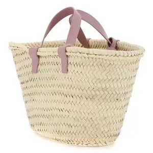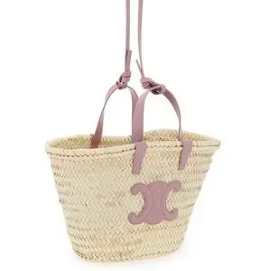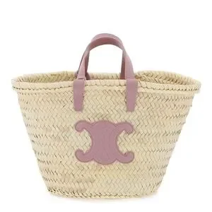 Celine Teen Triomphe Tote is crafted from natural raffia and purple leather trim .