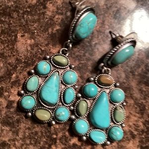 ~ Jewellery Box Cleanout/For Sale: a beautiful pair of FAUX turquoise dangle earrings. Length from top of earring to bottom: 2 inches long X 3/4 inches at the widest point. I purchased these from another Posher to complement a Double D Ranch biker jacket I bought for my birthday. Since then, they've been hardly been worn. PLEASE NOTE: THESE ARE NOT REAL MULTI-STONES AND ARE NOT REAL TURQUOISE. THE BACK OF THIS PAIR (see photos) IS SILVER-PLATED, NOT STERLING SILVER. The back and posts have been cleaned with alcohol and ready to wear. IF OU WANT THE LOOK OF REAL TURQUOISE WITHOUT SPENDING THE MONEY, THEN THIS PAIR IS FOR YOU. Feel free to make a reasonable offer or bundle with other jewellery items in my closet. Thank you. ~