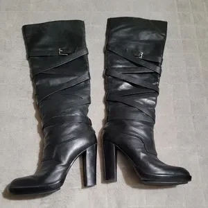 size 7 1/2, good condition, worn several times, black leather, silver hardware. 4 inch heel