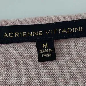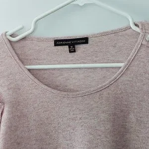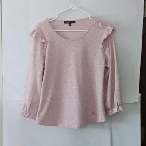 LIKE NEW! This soft pink sweater from Adrienne Vittadini features a lightweight polyester/rayon/spandex fabric with a woven look. Crew neck. Ruffles on front and back shoulders. Left front shoulder is embellished with 3 flower-shaped, sparkly plastic buttons; an extra button that came with the sweater will be included with purchase. 3/4 length sleeves with ruffled elastic cuffs. Silver-colored plastic AV logo charm is sewn just above the left bottom hem in the front. Relaxed fit. Pairs perfectly with light or white denim. See pics for fabric and garment care info. DISCOUNTED SHIPPING! ALL REASONABLE OFFERS ACCEPTED!