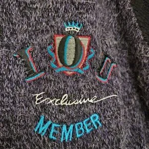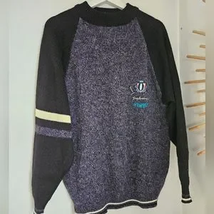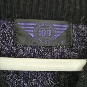 vintage 90's IOU international brand sweater. Black purple and white with hits of teal in the embroidered logo.