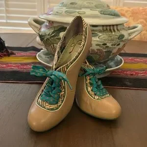 Poetic License Beige Shoes with Teal and Gold Accents