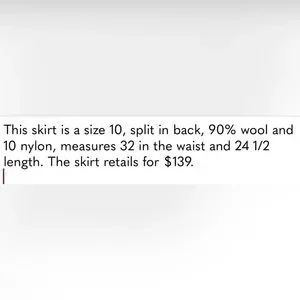 This skirt is a size 10, split in back, 90% wool and 10 nylon, measures 32 in the waist and 24 1/2 length. The skirt retails for $139.
