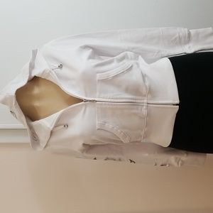 #kangaroo pockets. Amazing, beautiful set. jacket unstretched armpit to arm pit is 19" measures waist unstretched is 15" arm length from shoulder to cuff is 24".Bebe Logo on top of hoodie and down the sleeve bling and silver applique states 1976. Probally when company was founded.