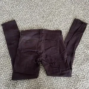 These brown skinny pants have a comfy amount of stretch and moto details like zippered pockets and a 6.5-inch zipper on the back leg hem to create different silhouettes. Can be dressed up or down. A true chocolate brown.