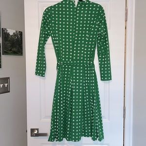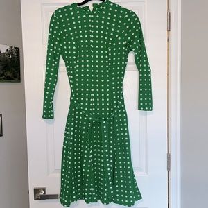Vintage green & white polka dot dress 1974-1983 size 10. Based on the union maker label the stress is from the mid 70s to early 80s beautiful a-line style dress. The neck is slightly higher with a full zipper running down the back. Skirt length hits just below the knee (I’m 5’5”). Size states 10, however I am a size 4, and the dress fits me perfectly. This dress is perfect for the spring, and would be fun to wear on St. Patty’s Day!