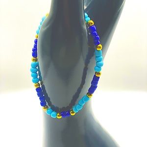 ✩Made with blue colored glass sead beads and plastic gold colored beads strung on clear elastic string