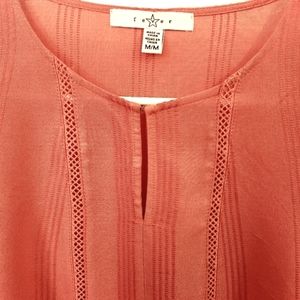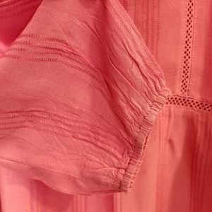 Fever peplum peasant blouse w/crochet trim in EUC. GORGEOUS coral color that didn't photograph accurately, but first photo is very close. Front keyhole w/hook & loop closure. Small pleats, ruching at shoulders & waist. 20" long sleeves, so not quite full length. Elastic cuffs. Semi-sheer, relaxed & flowy fit. 100% rayon w/no stretch. Faint mystery lighter area on back (pictured), idk what it is but it's not much lighter so not very noticeable. Is a mystery why Fever brand's not more trendy, it's much better quality than some super trendy brands in the same vein.