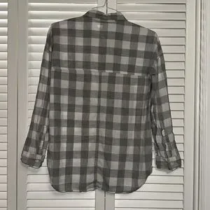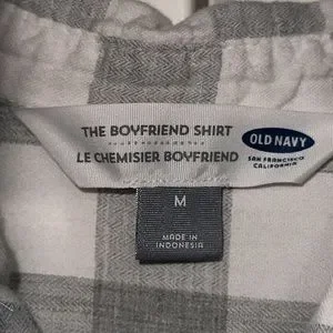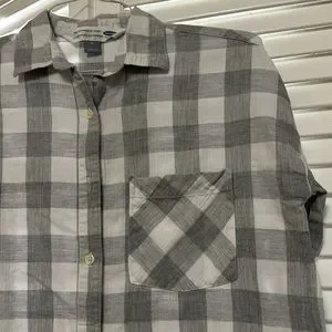Old Navy women’s grey and white checkered The Boyfriend button up shirt with breast pocket. Gently used with no signed of wear or stains. Very nice condition.