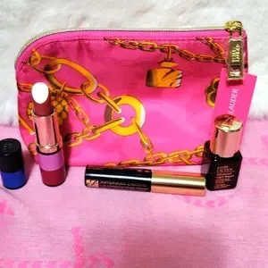 Includes deluxe size Sumptuous Extreme mascara in Extreme Black, Advanced night repair, small cosmetic bag, and full size Pure Color Envy lipstick in rebellious rose. All new and never used.