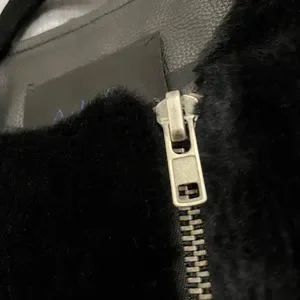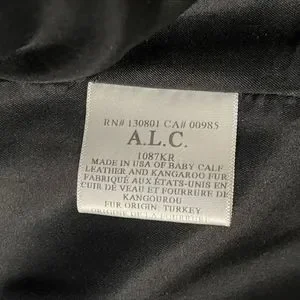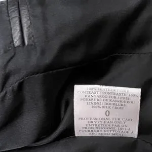 Crew neck. Silver-tone metal offset zipper closure. Interior slip-in pocket. Adjustable zipper cuffs. Straight hem. Hits lower waist. Black dyed kangaroo fur and calfskin leather. Retail $1795. Made in the USA.