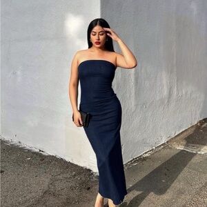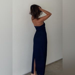 The slim-fitting Indigo Dark Denim Full Length Stretch Dress is crafted in soft denim fabric, featuring a tube neckline, a clean bodice with seaming details, slit at back, and center back zipper closure for the perfect fit. Pair it with boots and a coat or strappy heels for a day out!