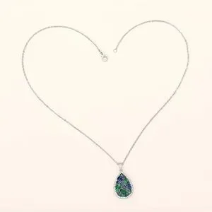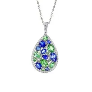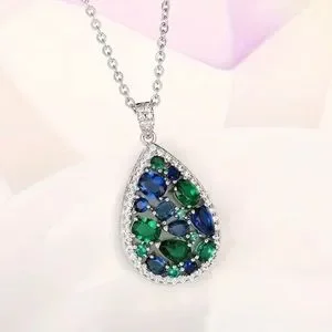 Beautiful teardrop shaped pendant with brilliant synthetic green and blue gemstones. 925 silver plated.