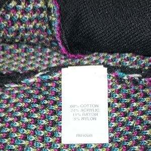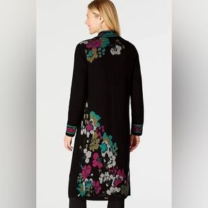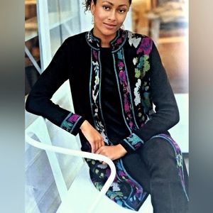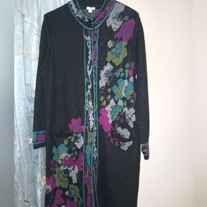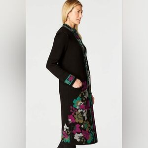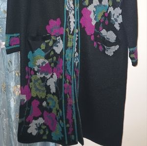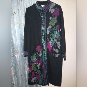 J. Jill sweater coat has a gorgeous and subtle somewhat abstract charmingly colorful floral design on a black background, two front functional pockets, is mid-weight with four snap button closure and one classic button on the