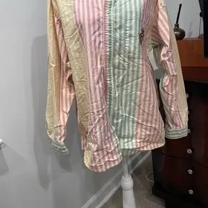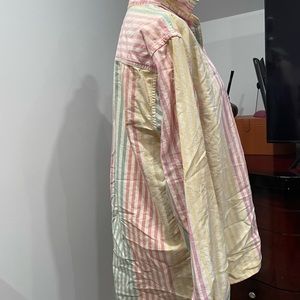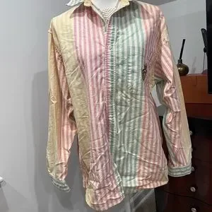 Vintage button down shirt.. colorful awesome shirt.. 💯 cotton.. has some marks and some ring around the collar.. has some paint on it..maybe someone knows the trick on taking the stuff off..