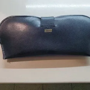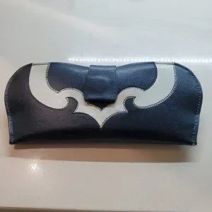THIS IS A TRUE VINTAGE LEATHER EYEGLASS CASE DONE IN BLACK AND WHITE. PLEASE NOTE THAT THE WHITE TRIM ON THE FRONT HAS A LIGHT DISCOLORING DUE TO AGE BUT NOTHING TO DETRACT FROM THE CASE ITSELF. THE CASE MEASURES 6" LONG AND 2-3/4" AT ITS WIDEST WIDTH. THE BRAND IS PRINCESS GARNER AND IS IN VERY GOOD VINTAGE CONDITION EXCEPT FOR THE LIGHT DISCLORING MENTIONED. PLEASE NOTE THAT THE CASE HAS A SNAP CLOSURE.