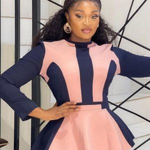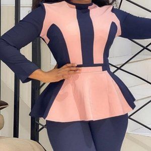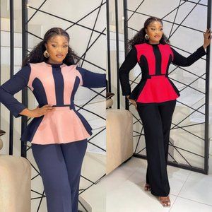 This 2-Tone Navy/Pink & Black/Red 2 piece pant suit is 🔥🔥🔥. It's super stylish, cute, and unique! Great for work, church events, weddings, graduations, and more!