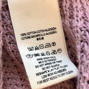 Free People Lavender Strappy Loose Raw Hem Sweater- Very Good to Excellent Pre-Owned Condition. No flaws to note. No rips/stains. 100% Cotton. Light lavender purple. Raw hem. Rounded V-neck with strappy cut outs. Runs big, could accommodate up to a medium. Approximate measurements taken w/garment laying flat: underarm to underarm 21", waist 26", hips 34", shoulder seam to hem 22" (front) 26.5" (back), sleeve 22".