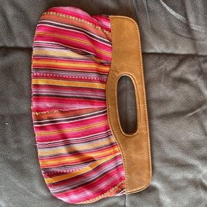 Multicolor clutch. Cloth and leather handle. No stains on the inside. Used.