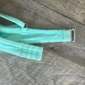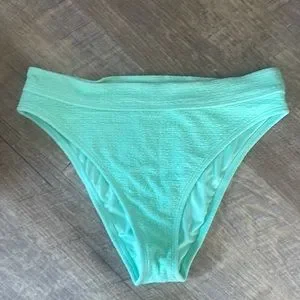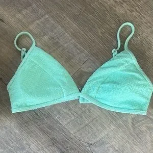 Gently loved bikini set by Billabong. Features a lovely sea foam green color on textured fabric. Top has adjustable straps and metal securement. Bottoms are high cut, high waisted in style. Size large
