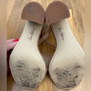 Sam Edelman | Women’s light brown block heels. Suede/soft material. Excellent used condition. See all photos for heels details, condition, and measurements. Toe prints on the front material (pictured) and black from walking on on bottom of shoe.