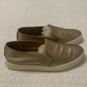 VINCE Blair perforated leather slip on shoes, sneakers, metallic gold tone uppers, with white soles size 7M. Some wear can be seen upon close inspection, as shown in pics and video.