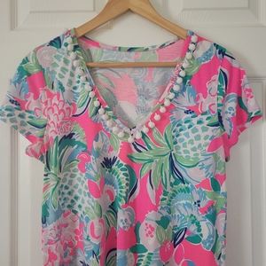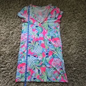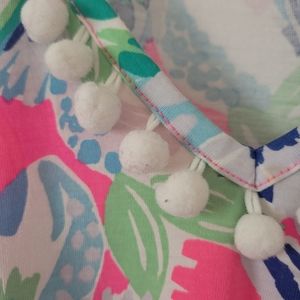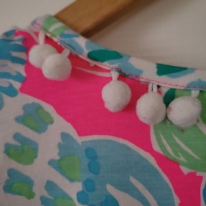 Lilly Pulitzer t-shirt dress in pre-owned condition. Shows some wear, one pom pom is missing around the neckline. 100% pima cotton. I purchased this brand new and only wore it twice.