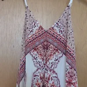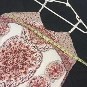 This dress is so very pretty and sure to turn some heads! It has that handkerchief style to it and is nice a flowy! The colors are very pretty fall colors. There is no size tag but with the adjustable straps and design cut it can fit multiple sizes.