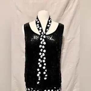 Vintage Judith Ann Creations Sequined Skirt Suit. From the 1980s. This comes as a 4 piece set, which includes the following: Skirt (Elastic Waist and Zip closure) , Sleeveless Top, Long Sleeve Jacket (Snap Button and Hook-eye closure), and Scarf. In good vintage condition overall. Sleeveless top does have one location on the left shoulder where the beads have started to unravel (please see photos). It does come with original Saks Fifth Avenue Tag. 100% Pure Silk.