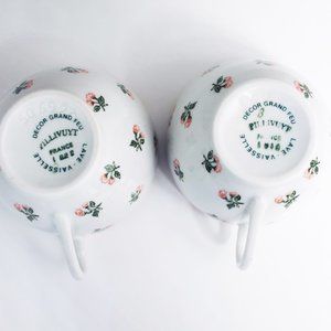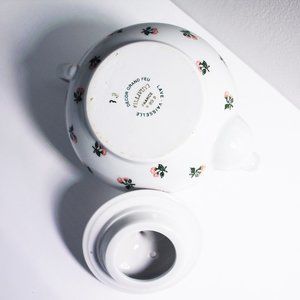 The set includes a teapot, creamer, sugar, and two cups and saucers. Made in France and dating from the 1980s, it has almost never been used and is still in excellent condition. Teapot holds about 24 ounces.