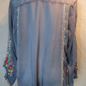 Grey embroidered blouse by Johnny Was!!! Stunning bright colored embroidery! Tie at neck, Cover button front. Cuffs are open (No closure) Cut out details on front and back!!