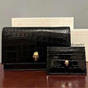 Brand new with tags Alexander McQueen Small Skull Bag and matching Skull Card Holder in croc-embossed black leather with gold-tone hardware. The bag features magnetic closure, one central compartment which accommodates a smartphone and one internal card pocket. Measures approx 7.4 x 5.1 x 1.9 inches. The card holder features 4 credit card slots and 1 central compartment. Measures approx 4 x 2.75 inches. Comes with 2 dust bags and 2 boxes.