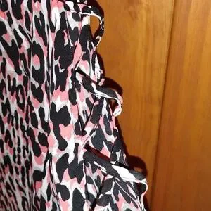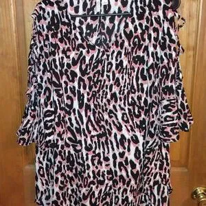 V neck peach,gray, black and white design top with criss-cross opening from shoulder to elbow size large
