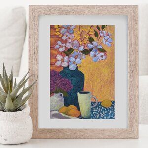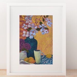 This is a Mini art print, 5 X 7" of my original artwork. Cute wall art, of a colorful still-life; with white flowers, yellow lemons, and a white tea cup. This art print is great for a desk or bookshelf or gallery wall.
