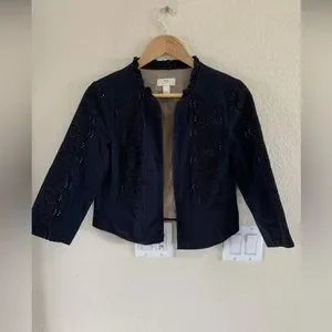 Loft cropped jacket with cute cut out details, hook and eye front closure and split cuff on sleeve. Front is slightly longer than back. Size 6.