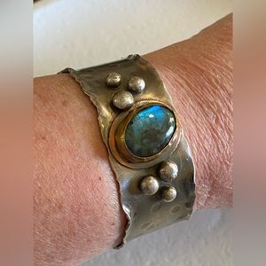 Oxidized & distressed sterling silver cuff with sterling silver adornments and a fiery blue labradorite set in a copper bezel. Will fit a 6-7” wrist. Currently set at 6.5 but has some give to make smaller or larger. This is a new item that has not been worn. Artesian handmade item by pmdesigns.