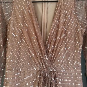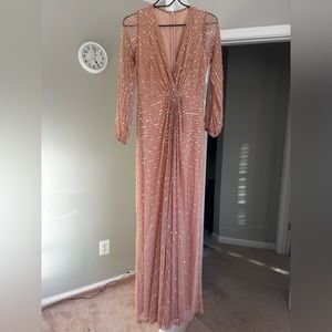 It's a long women's party dress in size 6 that fits 4, about the color, it might be light orange or light pink, as you can see in the pictures, it's never been worn and is in perfect condition.