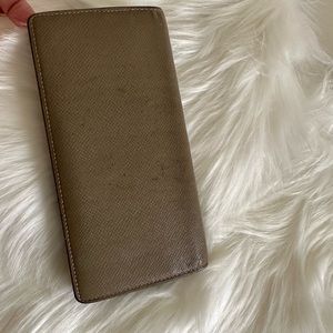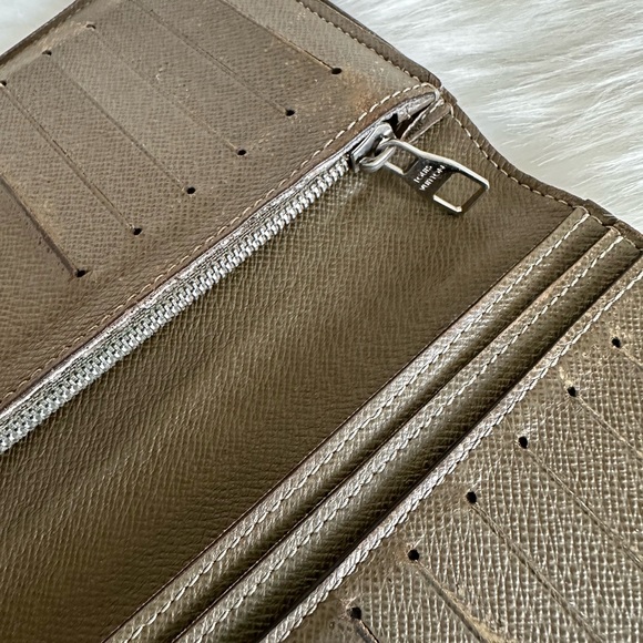 Authentic LV wallet does have initials. Was told you can get that out with acetone but did not try! let me know if you have any questions about it. Has slots for cards & cash