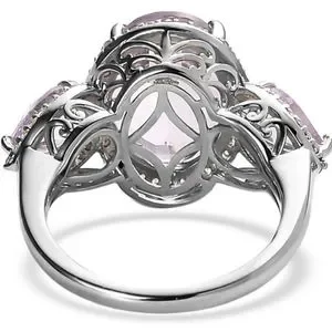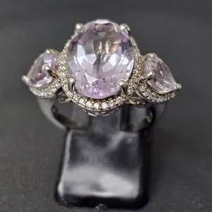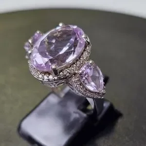 This is such a lovely colored amethyst ring. It has 7.50 carats of rose de france amethyst, but for a large gemstone ring, it still manages to look feminine and elegant. The size is a 6. It is stamped D'Joy 925. The setting has a platinum overlay over sterling silver.