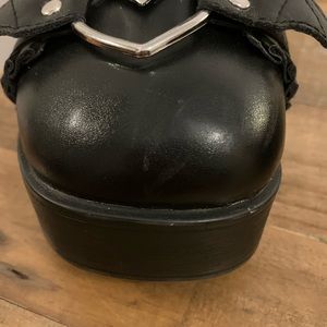 Adorable black platform shoes with round heel and T strap, featuring a cute heart silver buckle and batwing frill detail. My daughter used these for anime cosplay costumes. Small scratch on right toe, and minor scuffs on both toes, see pictures. All other areas in great condition. No size on shoe, but measurements are for size 5 according to size chart.