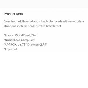A multi layered beaded , stretch bracelets set featuring acrylic discs, lustrous gold-tone beads and glass beads with lovely charms.