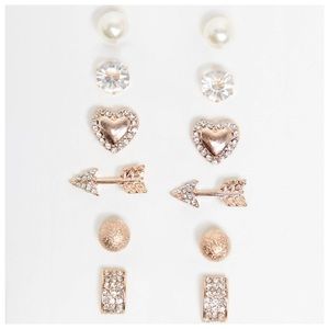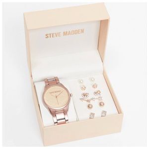 This Steve Madden rose gold tone set includes a watch and six pairs of earrings. Comes in gift box, as shown.