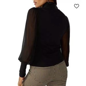 NWT Sanctuary Mock Neck black long sheer sleeved blouse, size Large. Machine washable delicates. Polyester and spandex blend material, pull on and fitted, body shaping. Sanctuary size chart and approximate measurements of blouse layed flat added.