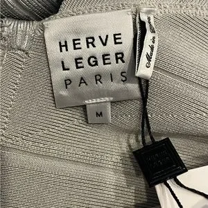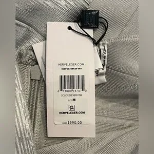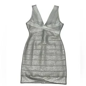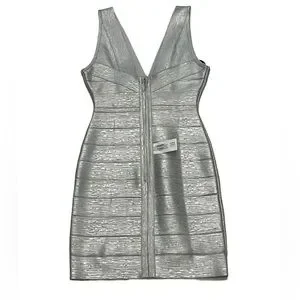 Herve Leger Deep V Bandage dress in silver foil. New with tags attached. Size medium. Has slight stretch. Runs small.