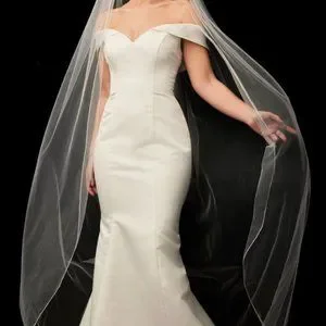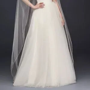 This new with tags long, one-tier veil is the perfect complement to any gown: just think of the beautiful image that will be created when the light, flowing fabric catches the wind.