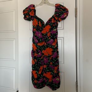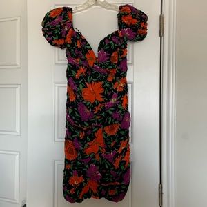 GUC. Black dress from Zara with an all over tropical floral print in purple and orange. Puffed sleeves that can be worn on or off the shoulder. Stitched chest cups. Hidden zipper up the back. Size XXL. Measurements unavailable.