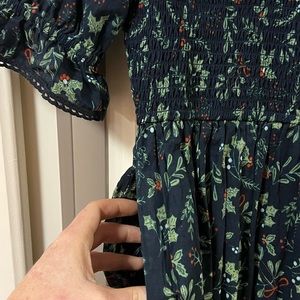 Perfect for all times of year, not just holidays! Lightweight fabric(100% cotton) lined through the whole dress! Puff sleeves, smocked waist, teird skirt and pockets! Print is just darling! I have to long of a torso(I’m 6ft) and it just doesn’t suit my frame as I would like.