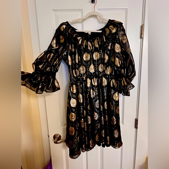 This is a handmade vintage dress has amazing puff sleeves, and a ruffled collar. Size medium. Black and gold. Lined. Has a healthy zipper.